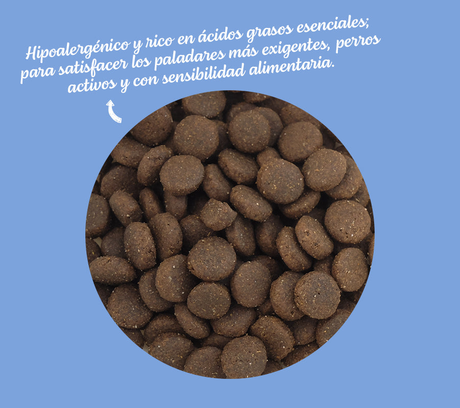 Esta dieta está indicada para perros adultos de todas las razas, que sean alérgicos o tengan una sensibilidad especial. Es una rica fuente de ácidos grasos esenciales, altamente palatable y fácilmente digestible.